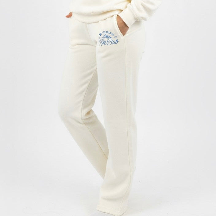 Woman wearing a white Bluebird Ski tracksuit with text on a white background